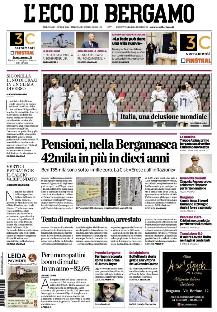 Ecco le notizie principali della prima pagina dell’edizione cartacea de L'Eco di Bergamo in edicola oggi:
