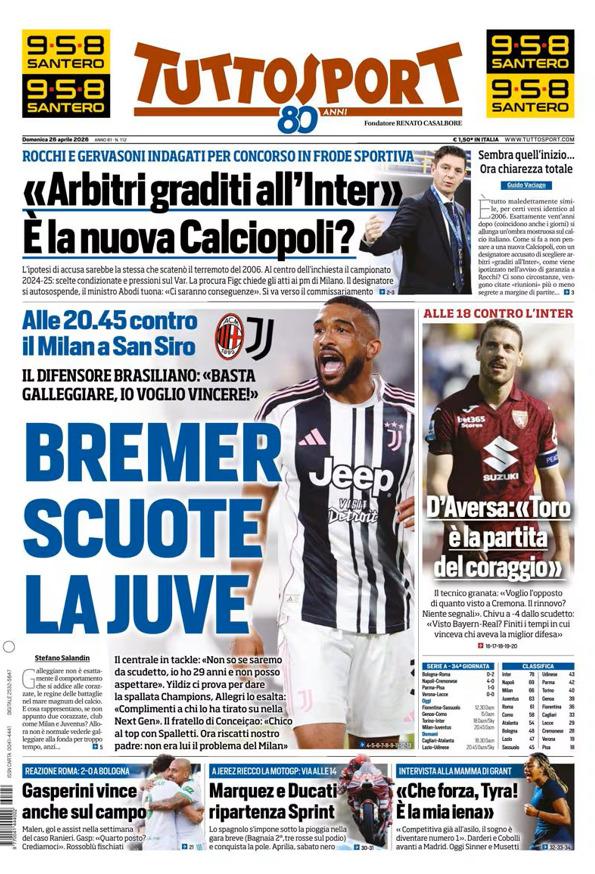 - 06:45 PRIMA PAGINA - TuttoSport: "Bremer scuote la Juve"