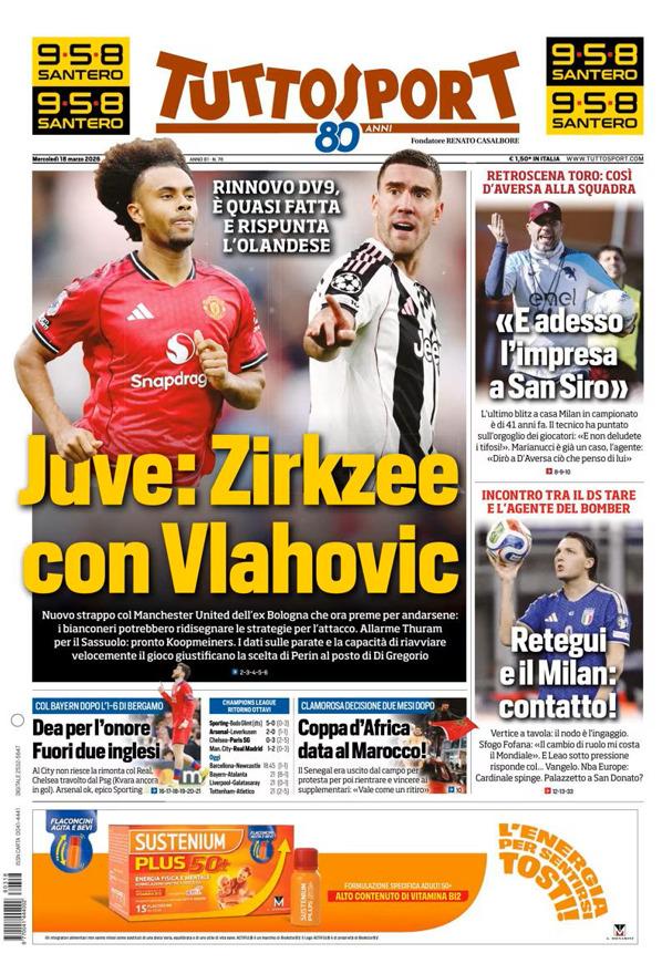 - 06:45 PRIMA PAGINA - TuttoSport: "Dea per l’onore. Fuori due inglesi"