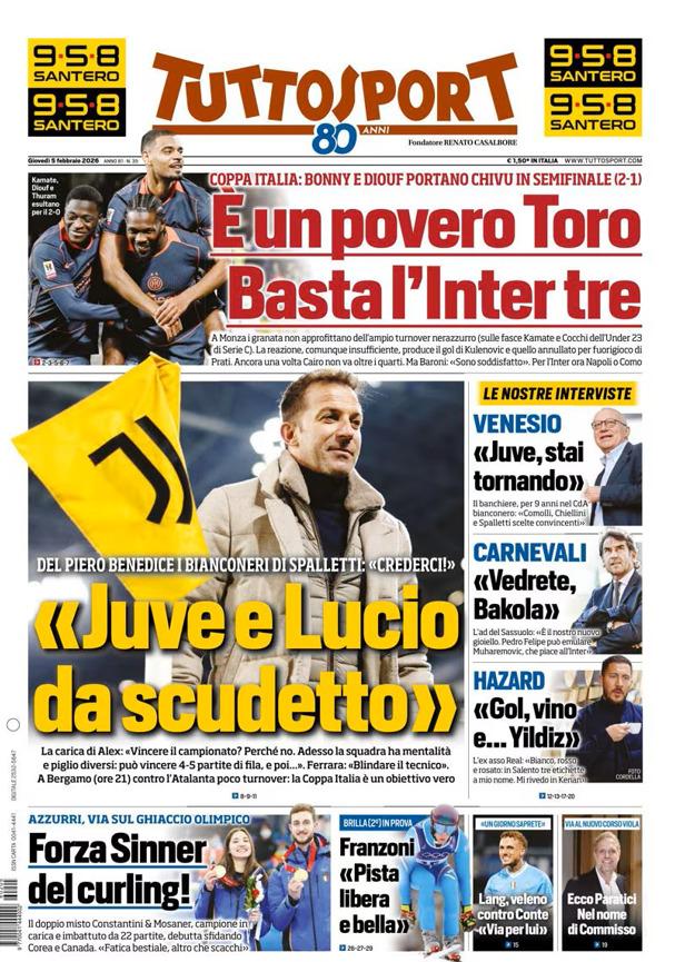 - 06:45 PRIMA PAGINA - TuttoSport: Del Piero: «Juve e Lucio da scudetto»