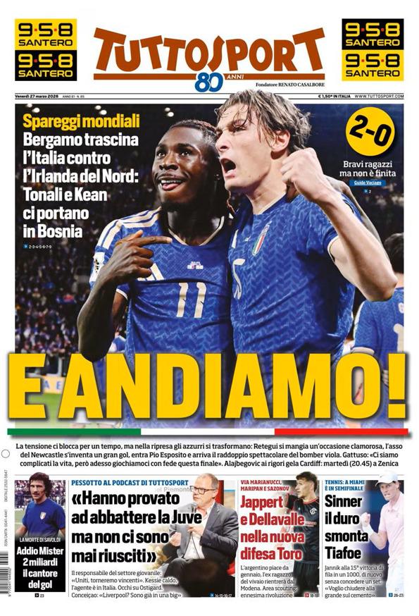 Spareggi mondiali Bergamo trascina l’Italia contro l’Irlanda del Nord: Tonali e Kean ci portano in Bosnia. La tensione ci blocca per un tempo, ma nella ripresa gli azzurri si trasformano: Retegui si mangia un’occasione clamorosa, l’asso del Newcastle s’inventa un gran gol, entra Pio Esposito e arriva il raddoppio spettacolare del bomber viola. Gattuso: «Ci siamo complicati la vita, però adesso giochiamoci con fede questa finale». Alajbegovic ai rigori gela Cardiff : martedì (20.45) a Zenica