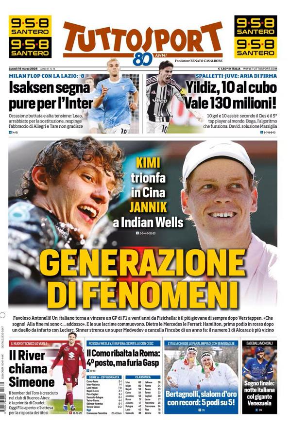 - 06:45 PRIMA PAGINA - TuttoSport: "Generazione di fenomeni"