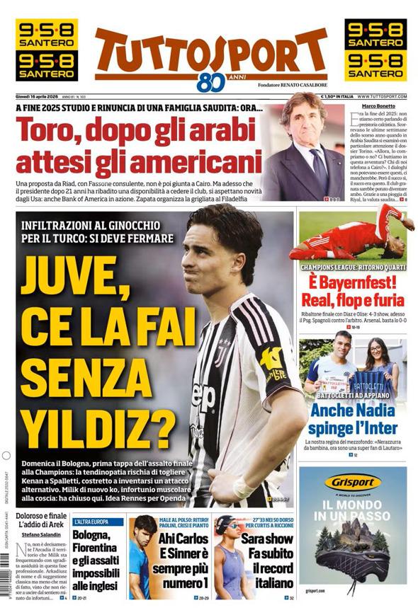 - 06:45 PRIMA PAGINA - TuttoSport: "Juve, ce la fai senza Yildiz"
