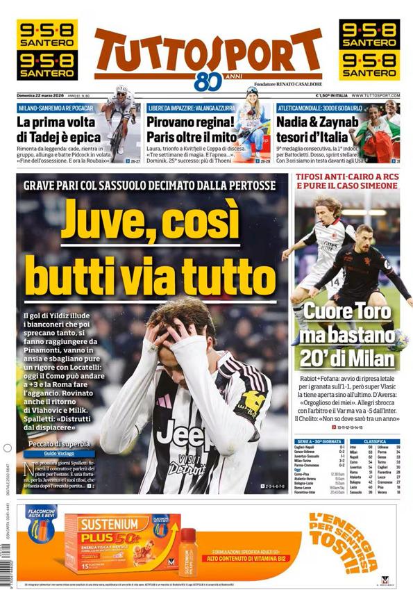 - 06:45 PRIMA PAGINA - TuttoSport: "Juve, così butti via tutto"