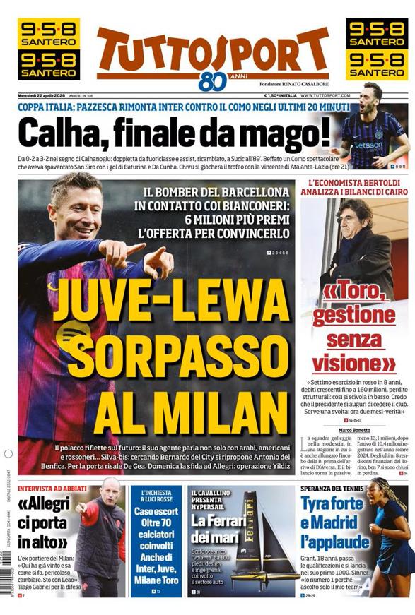 - 06:45 PRIMA PAGINA - TuttoSport: "Juve-Lewa sorpasso al Milan"