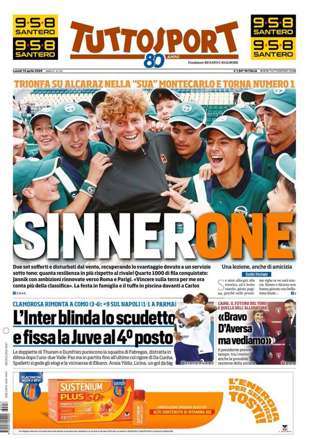 - 06:45 PRIMA PAGINA - Gazzetta dello Sport: "Sinner re di Montecarlo. Numero 1"