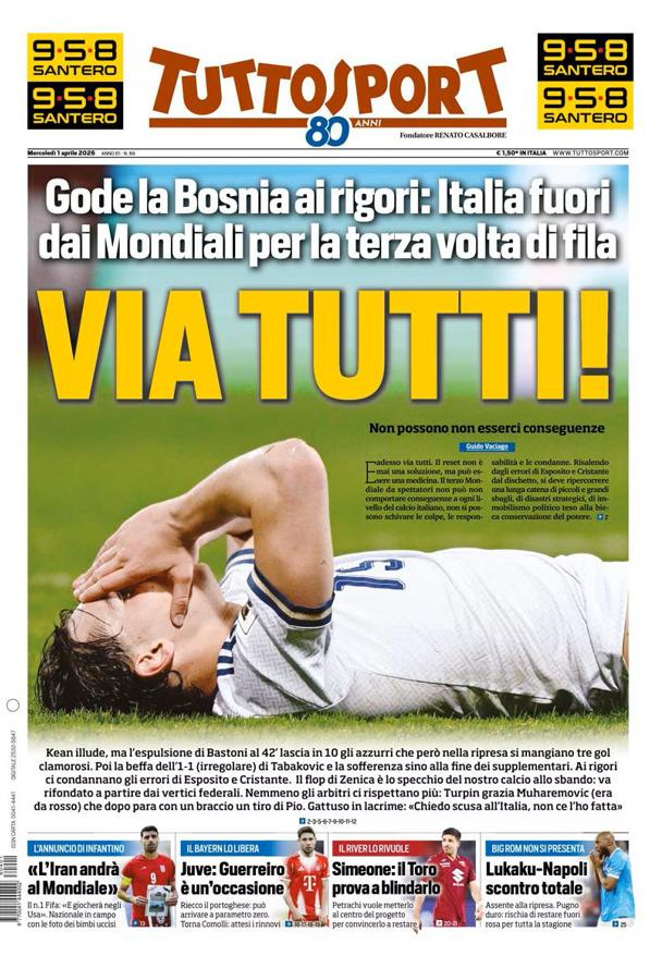 Kean illude, ma l’espulsione di Bastoni al 42’ lascia in 10 gli azzurri che però nella ripresa si mangiano tre gol clamorosi. Poi la beffa dell’1-1 (irregolare) di Tabakovic e la sofferenza sino alla fine dei supplementari. Ai rigori ci condannano gli errori di Esposito e Cristante. Il fop di Zenica è lo specchio del nostro calcio allo sbando: va rifondato a partire dai vertici federali. Nemmeno gli arbitri ci rispettano più: Turpin grazia Muharemovic (era da rosso) che dopo para con un braccio un tiro di Pio. Gattuso in lacrime: «Chiedo scusa all’Italia, non ce l’ho fatta»