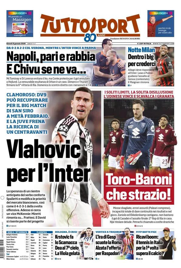 - 06:45 PRIMA PAGINA - TuttoSport: "Vlahovic per l’Inter"