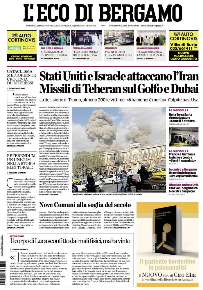Ecco le notizie principali della prima pagina dell’edizione cartacea de L'Eco di Bergamo in edicola oggi: