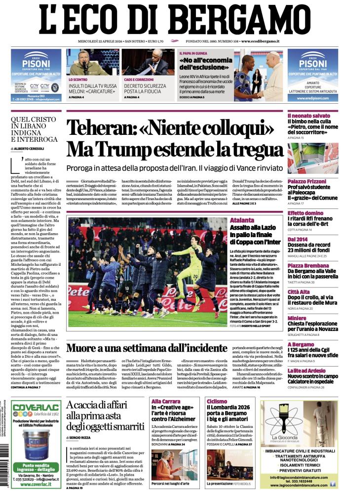 Ecco le notizie principali della prima pagina dell’edizione cartacea de L'Eco di Bergamo in edicola oggi: