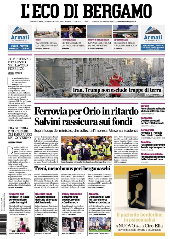 Ecco le notizie principali della prima pagina dell’edizione cartacea de L'Eco di Bergamo in edicola oggi: