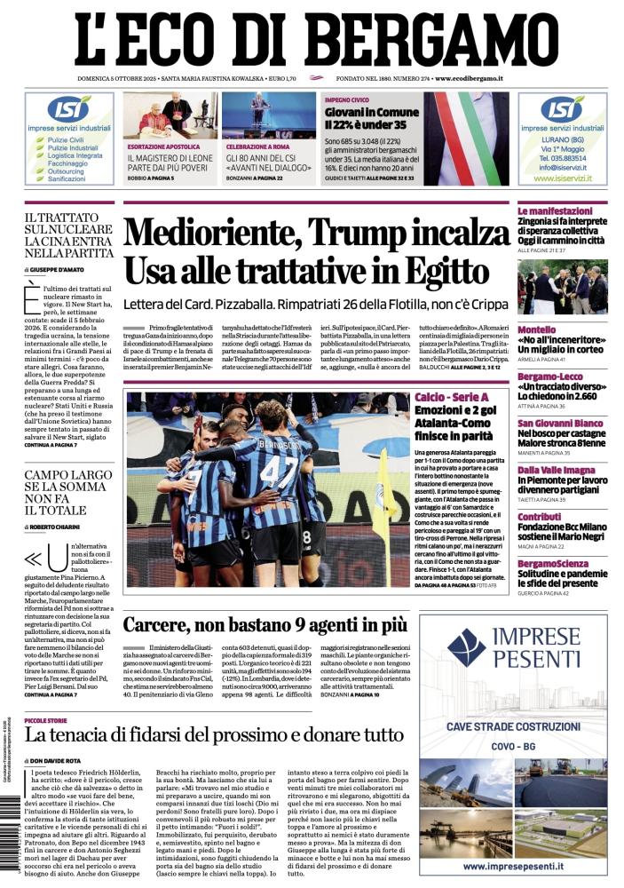 Ecco le notizie principali della prima pagina dell’edizione cartacea de "L’Eco di Bergamo" in edicola oggi: