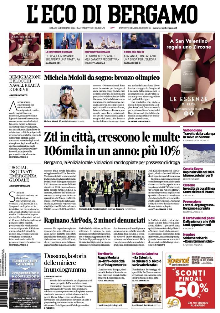 Viabilità e sicurezza - Ztl in città, crescono le multe - L'apertura del quotidiano è dedicata ai dati forniti dalla Polizia locale di Bergamo: nel corso dell'ultimo anno le sanzioni per gli accessi non autorizzati nelle Zone a Traffico Limitato sono salite a 106mila, segnando un incremento del 10%. Si evidenzia inoltre che le violazioni per possesso di droga sono raddoppiate.