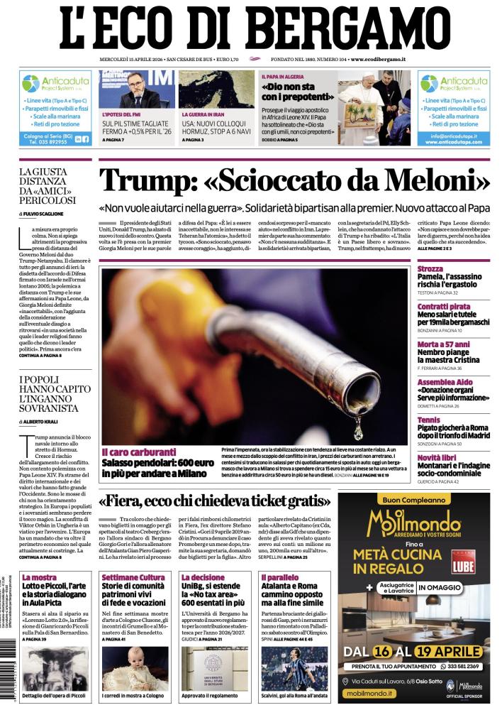 Ecco le notizie principali della prima pagina dell’edizione cartacea de L'Eco di Bergamo in edicola oggi: