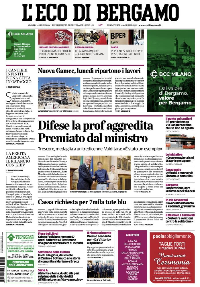 Ecco le notizie principali della prima pagina dell’edizione cartacea de L'Eco di Bergamo in edicola oggi: