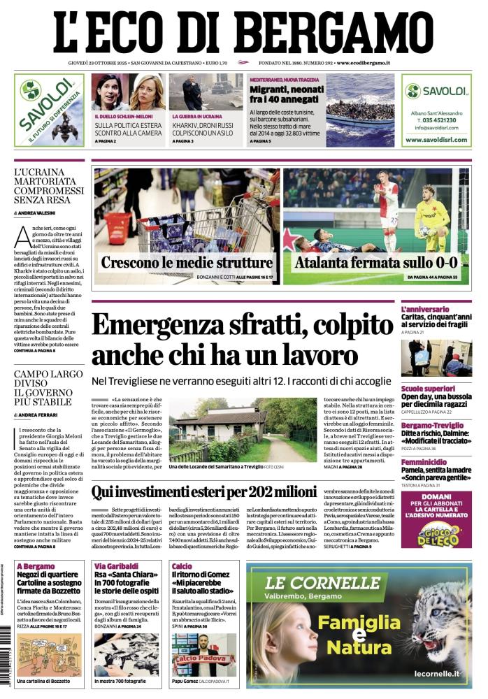 Ecco le notizie principali della prima pagina dell’edizione cartacea de "L’Eco di Bergamo" in edicola oggi: