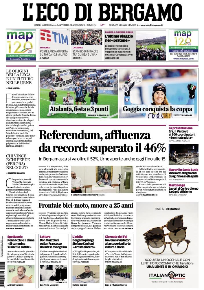 Ecco le notizie principali della prima pagina dell’edizione cartacea de L'Eco di Bergamo in edicola oggi: