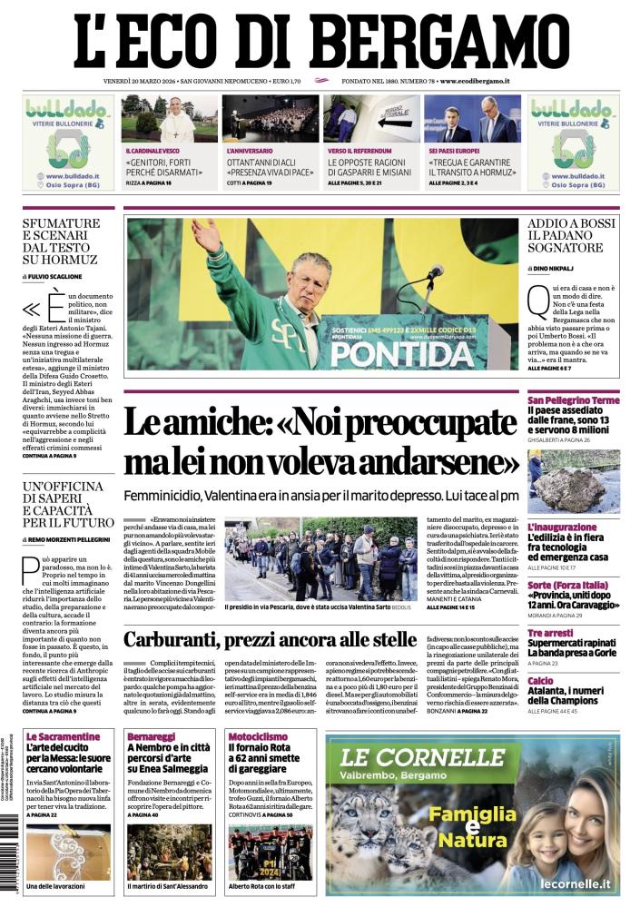 Ecco le notizie principali della prima pagina dell’edizione cartacea de L'Eco di Bergamo in edicola oggi: