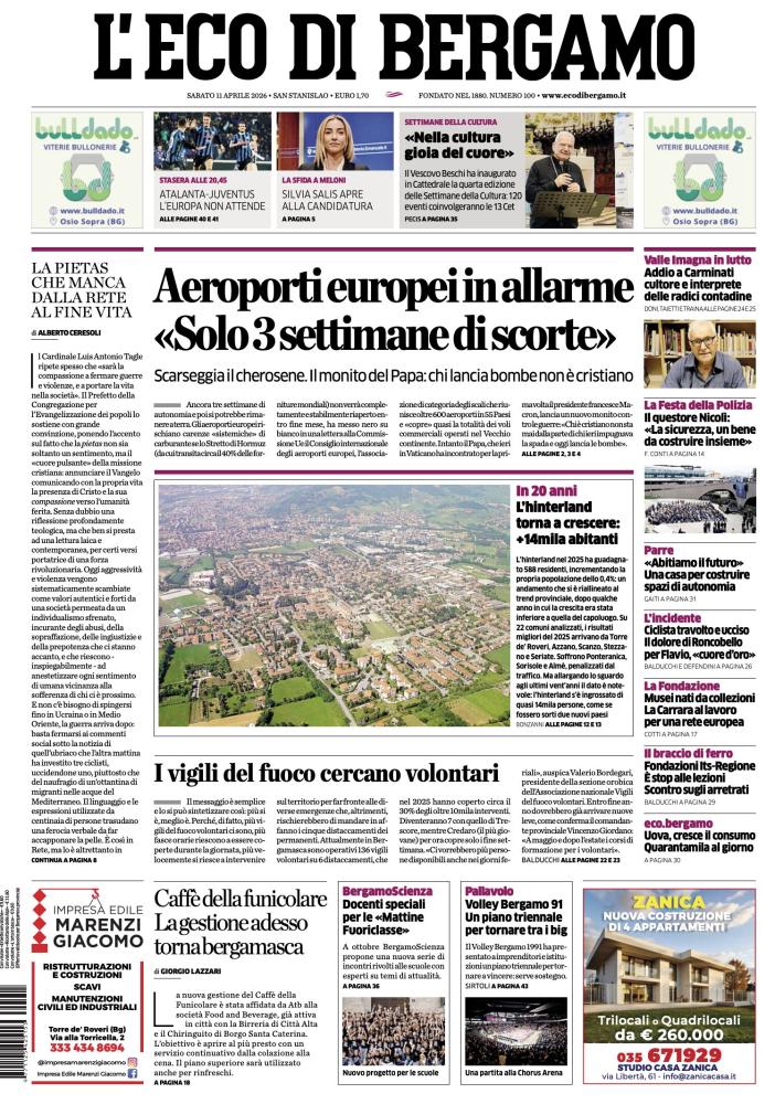 Ecco le notizie principali della prima pagina dell’edizione cartacea de L'Eco di Bergamo in edicola oggi: