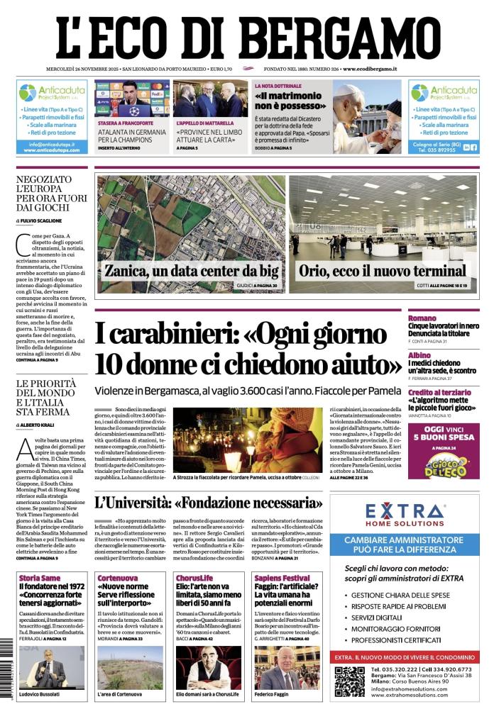 Il quotidiano apre con un titolo forte e doloroso riguardante la cronaca sociale: "I carabinieri: «Ogni giorno 10 donne ci chiedono aiuto»". In occasione della Giornata internazionale contro la violenza sulle donne, vengono resi noti i dati bergamaschi: al vaglio ci sono 3.600 casi l'anno. A Strozza si è tenuta una fiaccolata per ricordare Pamela. Spazio centrale dedicato anche alle grandi opere del territorio con due novità importanti: "Zanica, un data center da big" e l'ampliamento dell'aeroporto con "Orio, ecco il nuovo terminal".