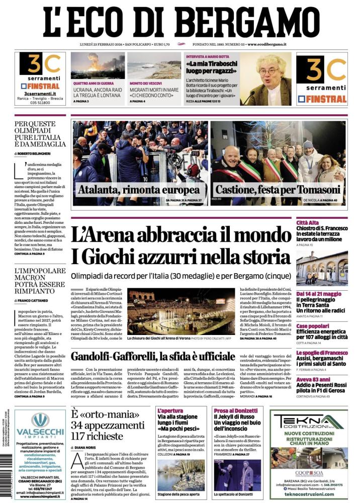 L'ARENA ABBRACCIA IL MONDO I GIOCHI AZZURRI NELLA STORIA - Olimpiadi da record per l'Italia (30 medaglie) e per Bergamo (cinque). Il sipario sulle Olimpiadi invernali di Milano Cortina è calato ieri sera con la cerimonia di chiusura all'Arena di Verona. «Grandissima Italia, sei stata di parola!», ha detto Giovanni Malagò, presidente della Fondazione Milano Cortina, nel suo discorso, prima che la presidente del Cio, Kirsty Coventry, dichiarasse chiusi i Giochi. Sono state Olimpiadi da 30 e lode, come le ha definite il presidente del Coni, Luciano Buonfiglio. Edizione da record per l'Italia, che conquistando 30 medaglie ha superato il risultato di Lillehammer 1994, e per Bergamo, che ha portato a casa cinque podi fra il bronzo di Sofia Goggia, il bronzo e l'argento di Michela Moioli, il bronzo di Sara Conti con Niccolò Macii e l'argento di Federico Tomasoni.
