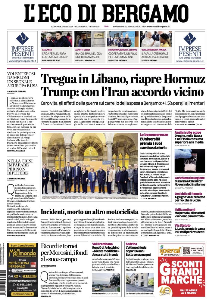 Ecco le notizie principali della prima pagina dell’edizione cartacea de L'Eco di Bergamo in edicola oggi: