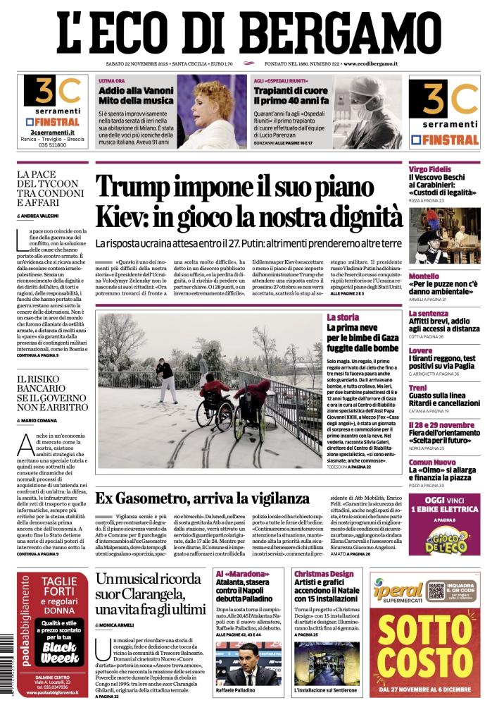 Ecco le notizie principali della prima pagina dell’edizione cartacea de "L’Eco di Bergamo" in edicola oggi: