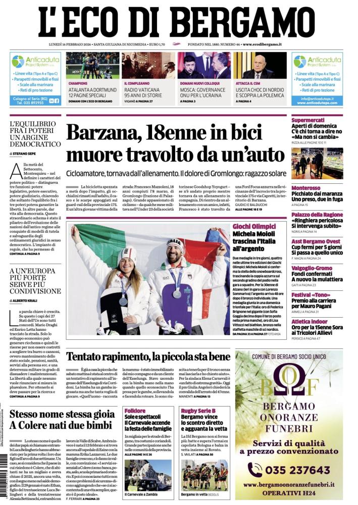 Ecco le notizie principali della prima pagina dell’edizione cartacea de L'Eco di Bergamo in edicola oggi: