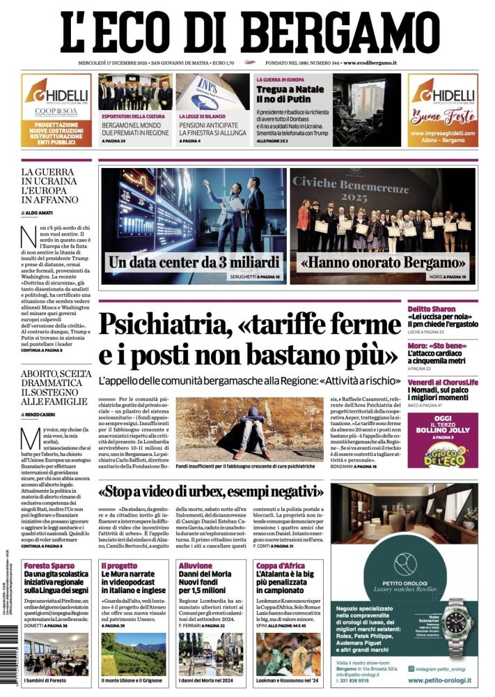 ECONOMIA E CITTÀ - Investimento monstre sul territorio: «Un data center da 3 miliardi». Un progetto tecnologico di enorme portata sbarca nella provincia. - Riconoscimenti civici: «Civiche Benemerenze 2025. Hanno onorato Bergamo». La cerimonia di premiazione dei cittadini illustri.
