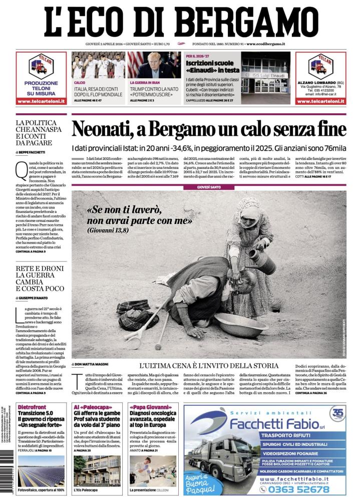 Ecco le notizie principali della prima pagina dell’edizione cartacea de L'Eco di Bergamo in edicola oggi: