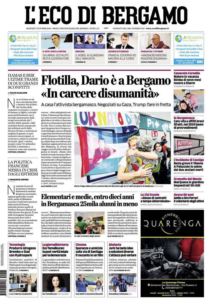 Ecco le notizie principali della prima pagina dell’edizione cartacea de "L’Eco di Bergamo" in edicola oggi: