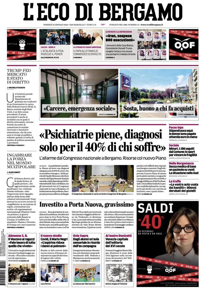 Ecco le notizie principali della prima pagina dell’edizione cartacea de L'Eco di Bergamo in edicola oggi: