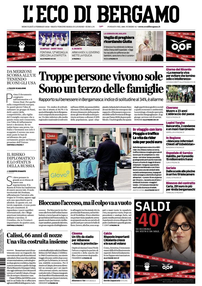 Ecco le notizie principali della prima pagina dell’edizione cartacea de L'Eco di Bergamo in edicola oggi: