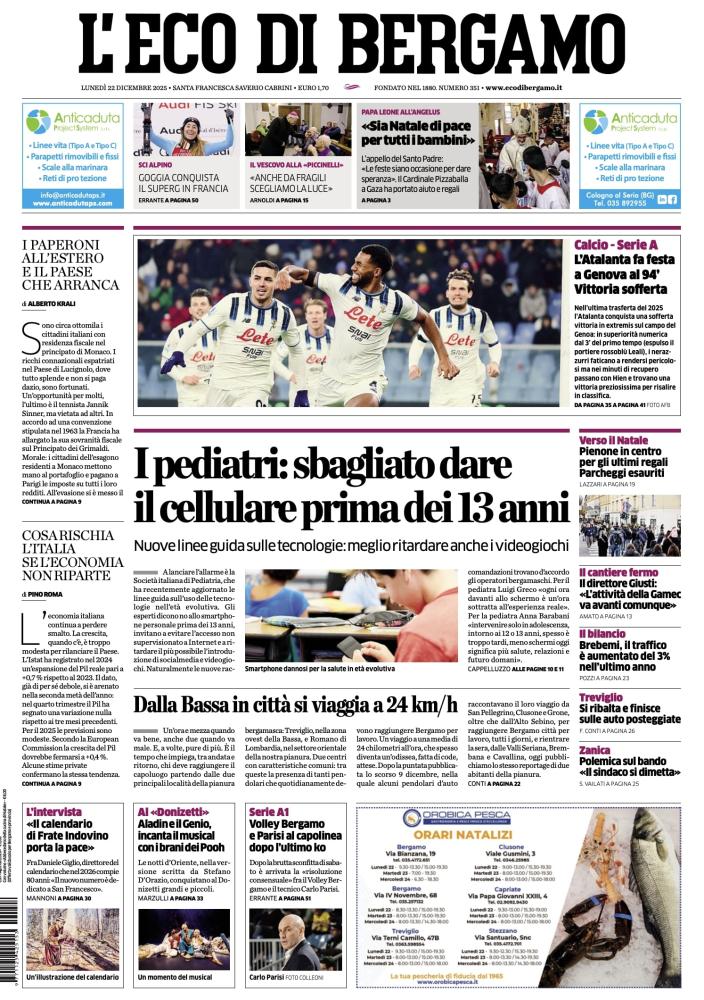 FOCUS ATALANTA: VITTORIA AL FOTOFINISH - In taglio alto, il successo sofferto dei nerazzurri. «L'Atalanta fa festa a Genova al 94'. Vittoria sofferta». Nell'ultima trasferta del 2025, la squadra conquista tre punti in extremis sul campo del Genoa. Nonostante la superiorità numerica dal 3° minuto (espulso il portiere rossoblù Leali), i nerazzurri faticano a rendersi pericolosi ma trovano il gol preziosissimo per la classifica nei minuti di recupero.