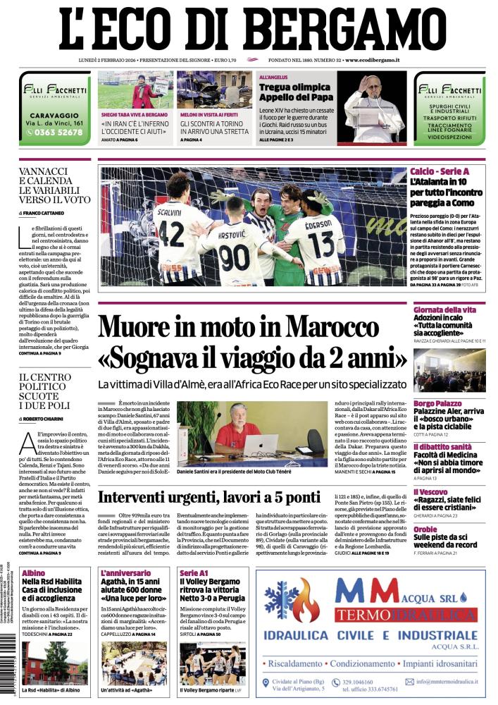 Ecco le notizie principali della prima pagina dell’edizione cartacea de L'Eco di Bergamo in edicola oggi:
