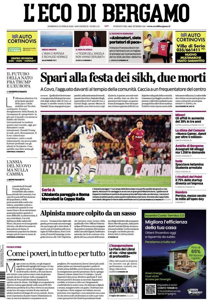 Ecco le notizie principali della prima pagina dell’edizione cartacea de L'Eco di Bergamo in edicola oggi: