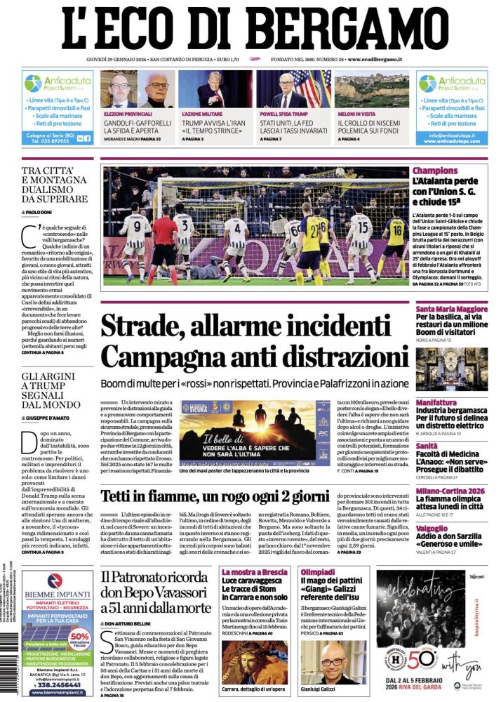 Ecco le notizie principali della prima pagina dell’edizione cartacea de L'Eco di Bergamo in edicola oggi: