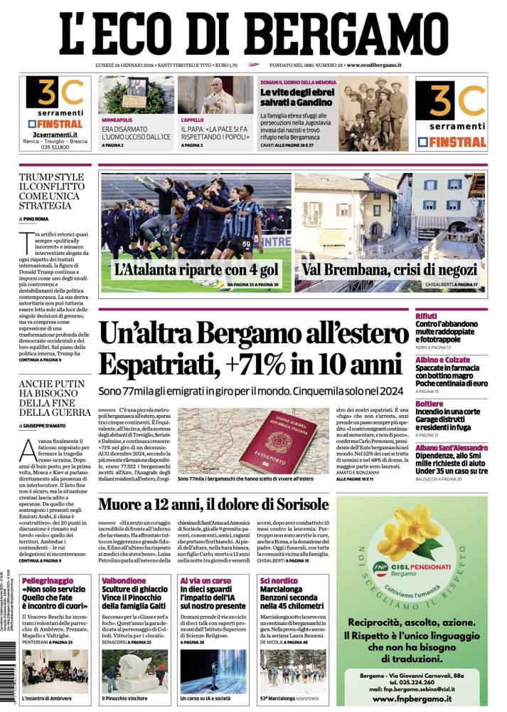Ecco le notizie principali della prima pagina dell’edizione cartacea de L'Eco di Bergamo in edicola oggi: