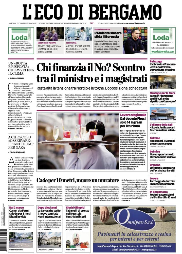 Ecco le notizie principali della prima pagina dell’edizione cartacea de L'Eco di Bergamo in edicola oggi: