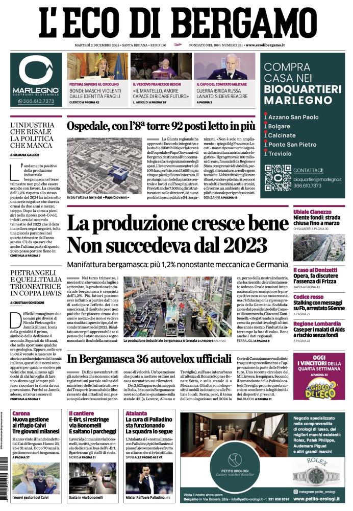 Ecco le notizie principali della prima pagina dell’edizione cartacea de L'Eco di Bergamo in edicola oggi: