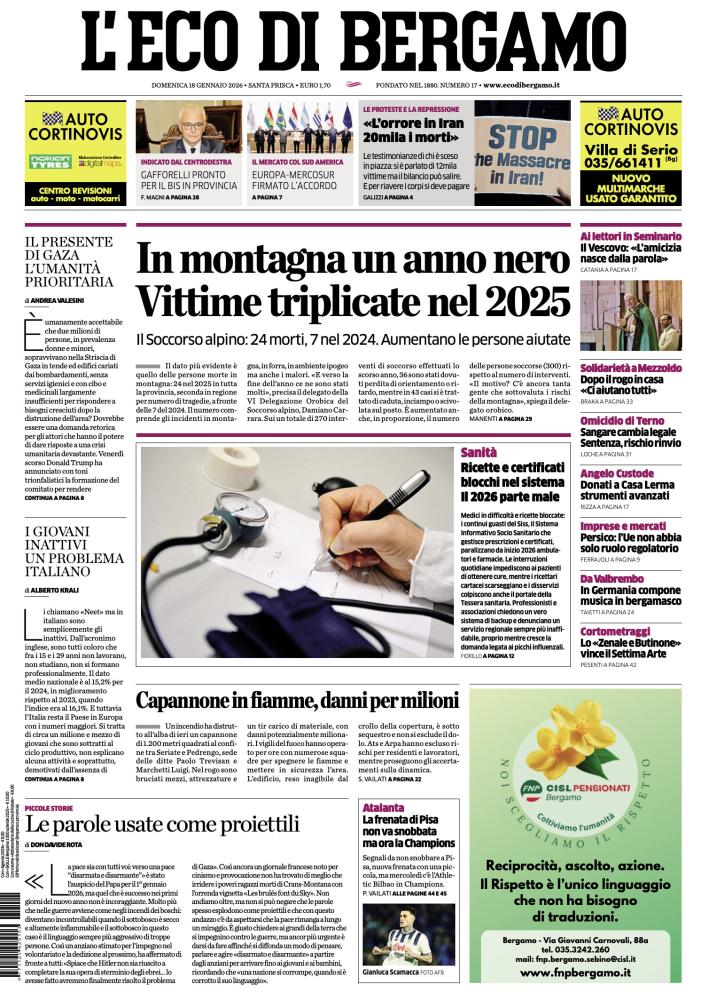 Ecco le notizie principali della prima pagina dell’edizione cartacea de L'Eco di Bergamo in edicola oggi: