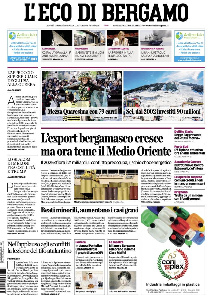 Ecco le notizie principali della prima pagina dell’edizione cartacea de L'Eco di Bergamo in edicola oggi: