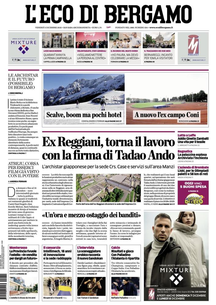 L'apertura del quotidiano è dedicata a una svolta storica per l'urbanistica cittadina. L'area Ex Reggiani si appresta a rinascere diventando la nuova sede dell'impresa Crs e ospitando servizi, il tutto sotto la prestigiosa firma dell'archistar giapponese Tadao Ando. Il progetto, definito un "unicum" nella storia recente di Bergamo, prevede il recupero degli edifici storici e nuove realizzazioni sull'area Manzi, mantenendo un forte legame identitario con il passato industriale.