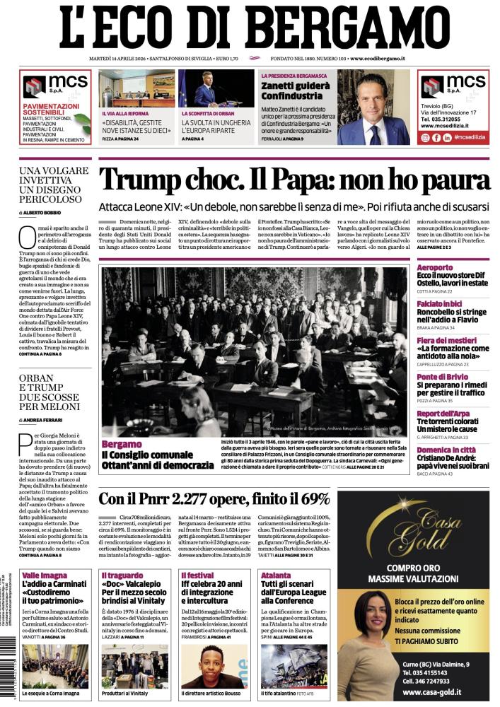 Ecco le notizie principali della prima pagina dell’edizione cartacea de L'Eco di Bergamo in edicola oggi: