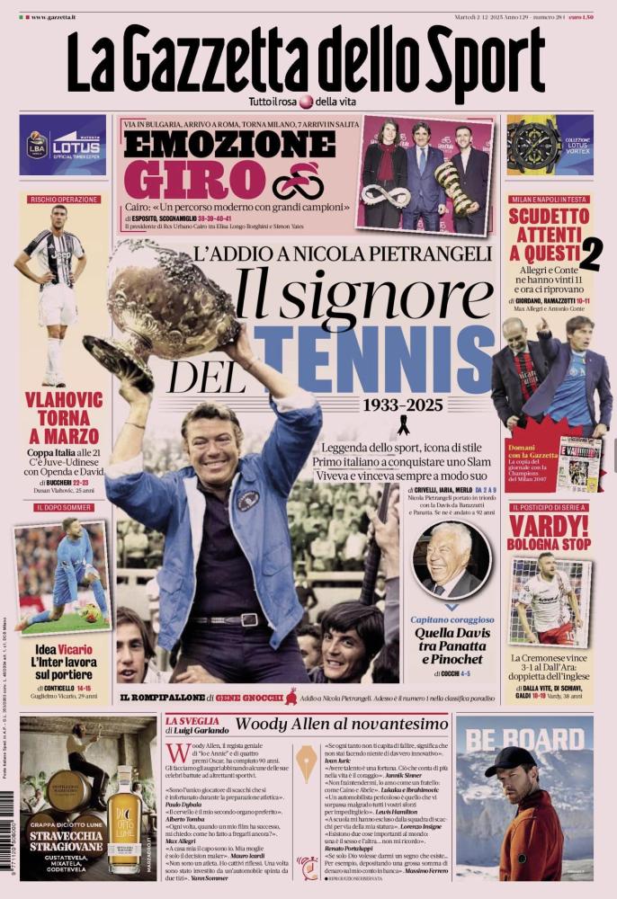 La "Rosea" dedica l'intera pagina a una leggenda dello sport italiano con un titolo commosso: "Il signore DEL TENNIS 1933-2025". Si è spento Nicola Pietrangeli, definito "icona di stile" e "primo italiano a conquistare uno Slam". Il quotidiano lo ricorda come colui che "viveva e vinceva sempre a modo suo". Di spalla, un focus sulla storica Coppa Davis vinta da capitano nel 1976 ("Quella Davis tra Panatta e Pinochet").