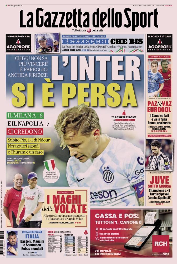 - 06:45 PRIMA PAGINA - La Gazzetta dello Sport: "Atalanta di misura, l'Inter si è persa"