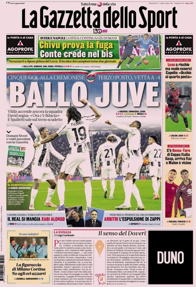 Juve: Manita Alla Cremonese - L'apertura celebra la travolgente vittoria dei bianconeri nel posticipo. Il titolo «BALLO JUVE» accompagna l'immagine dell'esultanza di Thuram, Weah e compagni. La squadra di Luciano Spalletti ne fa cinque alla Cremonese. - Kenan Yildiz "accende ancora la squadra", mentre Jonathan David trova il gol: «Ora c'è fiducia». Con questo successo, la Juventus sale al terzo posto portandosi a -4 dalla vetta. Spalletti "sale sul treno scudetto".