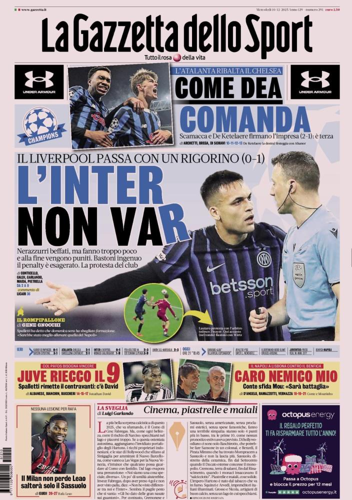 Tutt'altro umore in casa nerazzurra milanese. «L'INTER NON VAR» è il titolo polemico che gioca sull'assenza di tutela arbitrale. Il Liverpool passa a San Siro con un "rigorino" (0-1), ma la moviola fa discutere. Si parla di Bastoni ingenuo ma anche di penalty esagerato. La