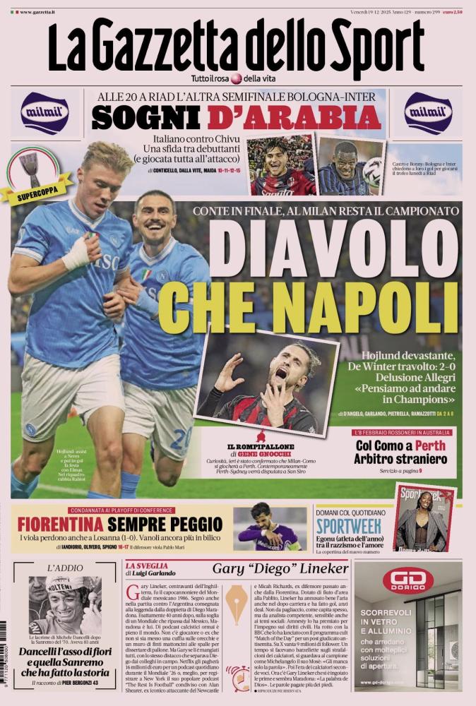 - 06:45 PRIMA PAGINA - La Gazzetta dello Sport: "Diavolo che Napoli"