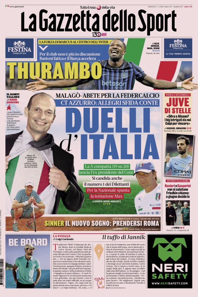Titolo principale - Duelli d'Italia. Malagò-Abete per la Federcalcio. Ct azzurro: Allegri sfida Conte. La A compatta (19 su 20) lancia l'ex presidente del Coni. Si candida anche il numero 1 dei Dilettanti. Per la Nazionale spunta la tentazione Max.